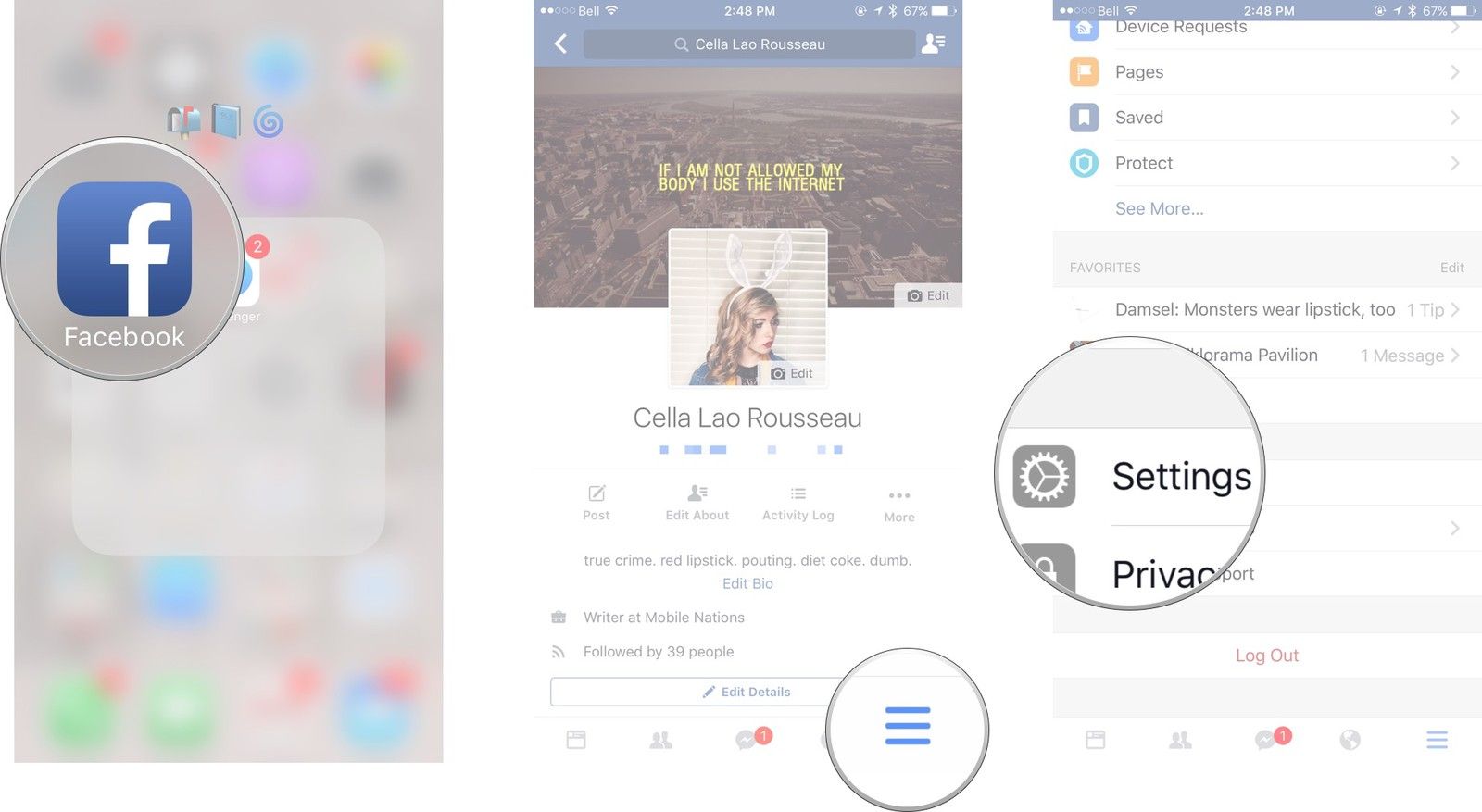 обновленный Февраль 2017 чтобы отразить изменения в интерфейсе приложения Facebook для iPhone.