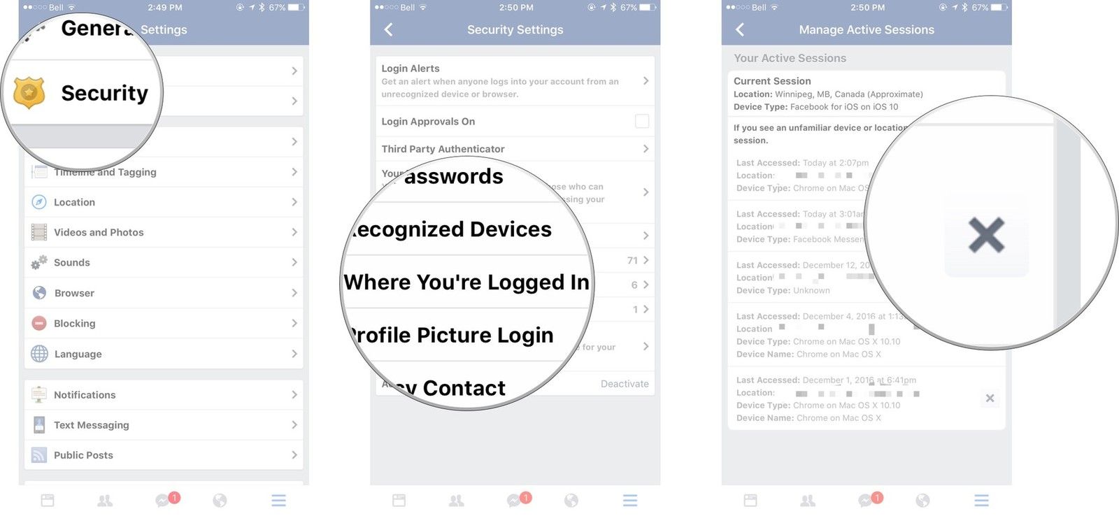 Здесь вы можете просмотреть (и завершить) все сеансы для вашей учетной записи Facebook. Нажмите Икс удалить активную сессию из вашей учетной записи.