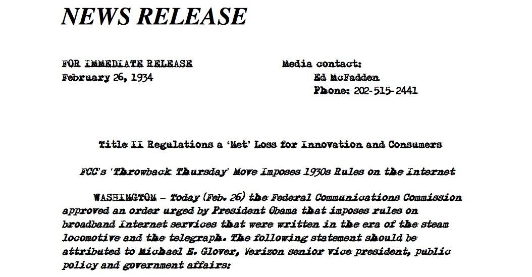 За исключением забавной истории, Verizon: Закон о Федеральной комиссии по связи был принят в июне 1934 года, и вступил в силу в июле. Ваш пресс-релиз за февраль 1934 года жалуется на закон, который еще не был принят, так же, как вы жалуетесь на правила сетевого нейтралитета, которые еще не вступили в силу.