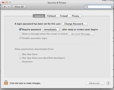 - Убедитесь, что ваш Mac требует пароль, чтобы разбудить его. Меню> Системные настройки> Безопасность Конфиденциальность> вкладка «Общие»