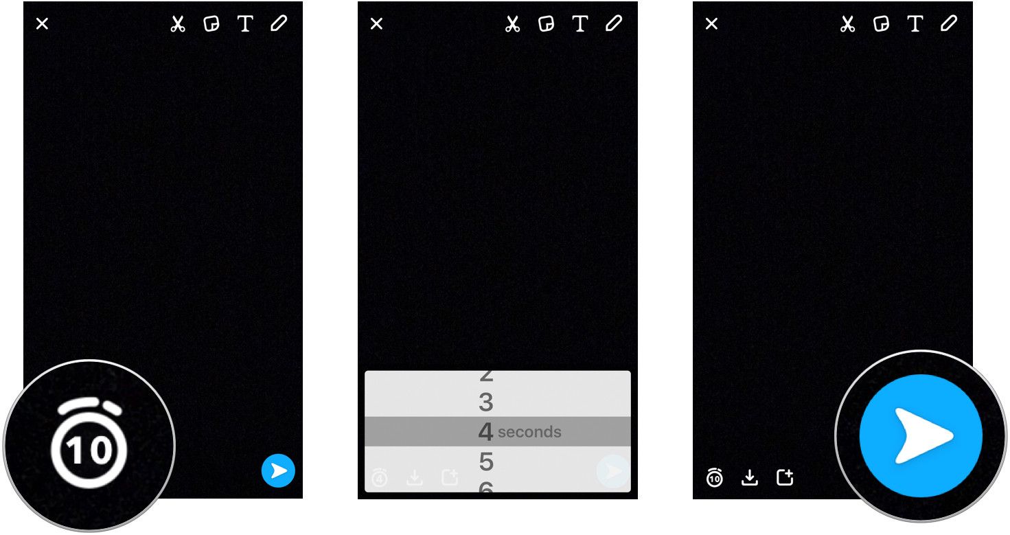 - Нажмите значок секундомера в нижней части экрана выберите время исчезновения фотографии — от одной до 10 секунд.