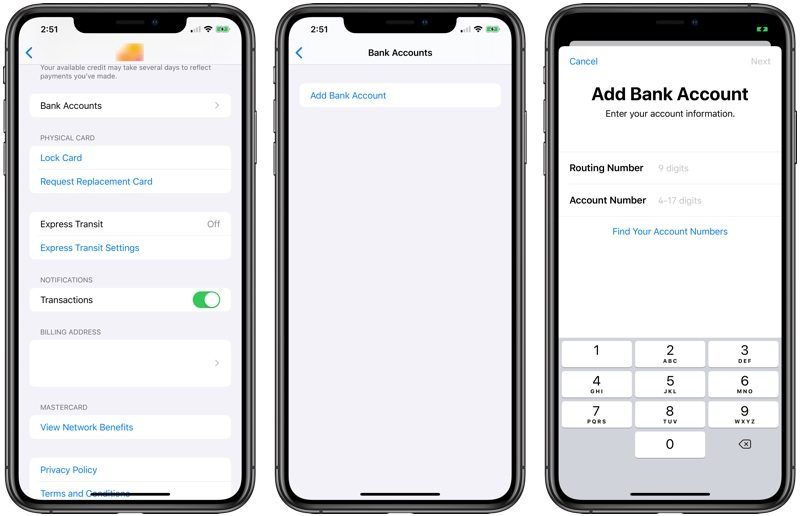 Вы можете добавить несколько банковских счетов на свою «Яблочную карту», но первый, который вы добавите, станет вашим банковским счетом по умолчанию для осуществления платежей. Чтобы добавить банковский счет, вам понадобится номер вашего банковского счета и номер банковского маршрута. С теми, кто готов подать, просто следуйте этим шагам.