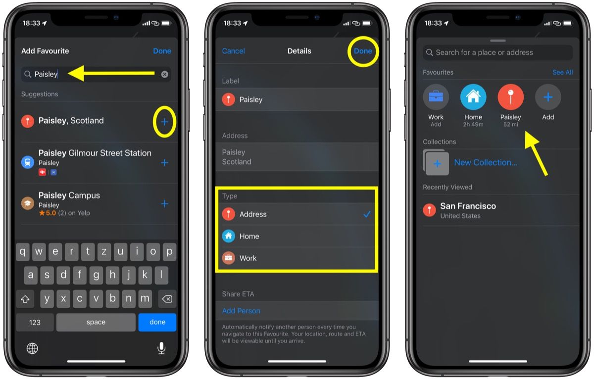 Вы можете добавить местоположение в Избранное в любое время, когда вы добавляете булавку на карту. Просто нажмите на место на карте, которое вы хотите добавить в избранное, а затем отобразите детали местоположения на экране, проведя пальцем вверх от ручки для перетаскивания. Вы увидите вариант ниже, чтобы Добавить в избранное. Нажмите значок со звездочкой рядом с ним, и местоположение будет добавлено в список избранных мест.