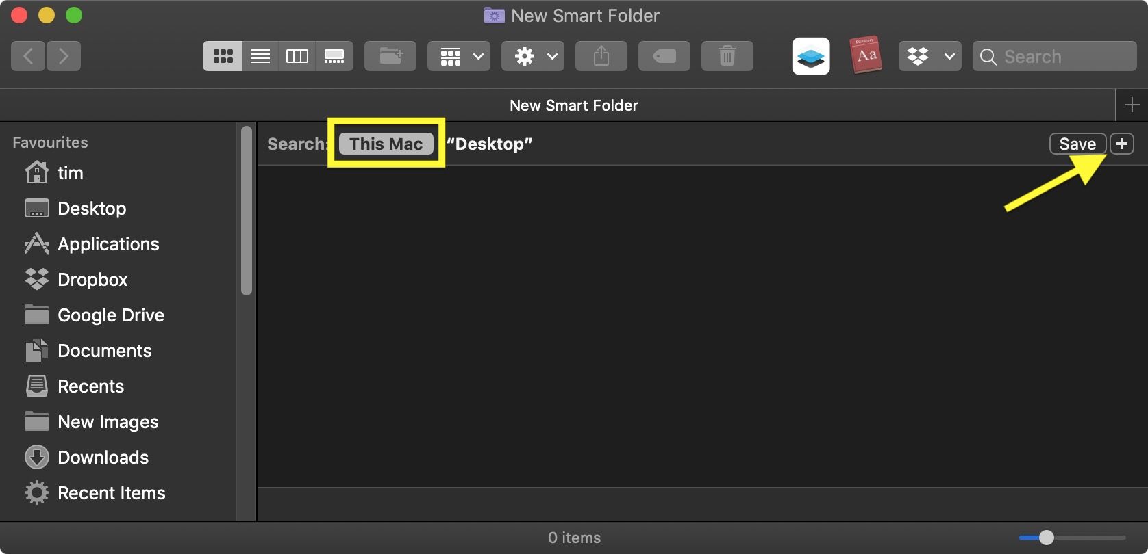 - В открывшемся окне Finder убедитесь, что заголовок поиска выбран как Этот мак, затем щелкните значок плюса в правом верхнем углу области просмотра.
