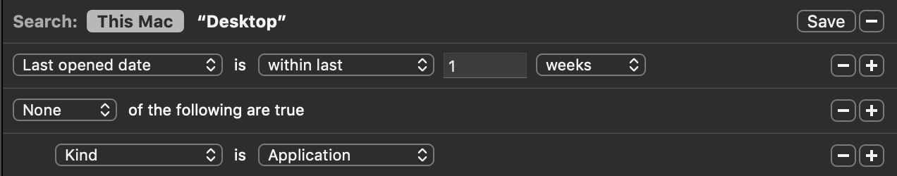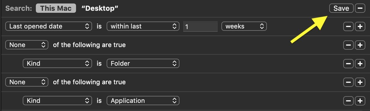 - Теперь, удерживая вариант ключ. Обратите внимание, что значок «плюс» в конце строки меняется на многоточие. Нажмите на нее, и вы сможете добавить параметры поиска, которые исключают определенные элементы, такие как приложения и папки, из вашего списка последних.