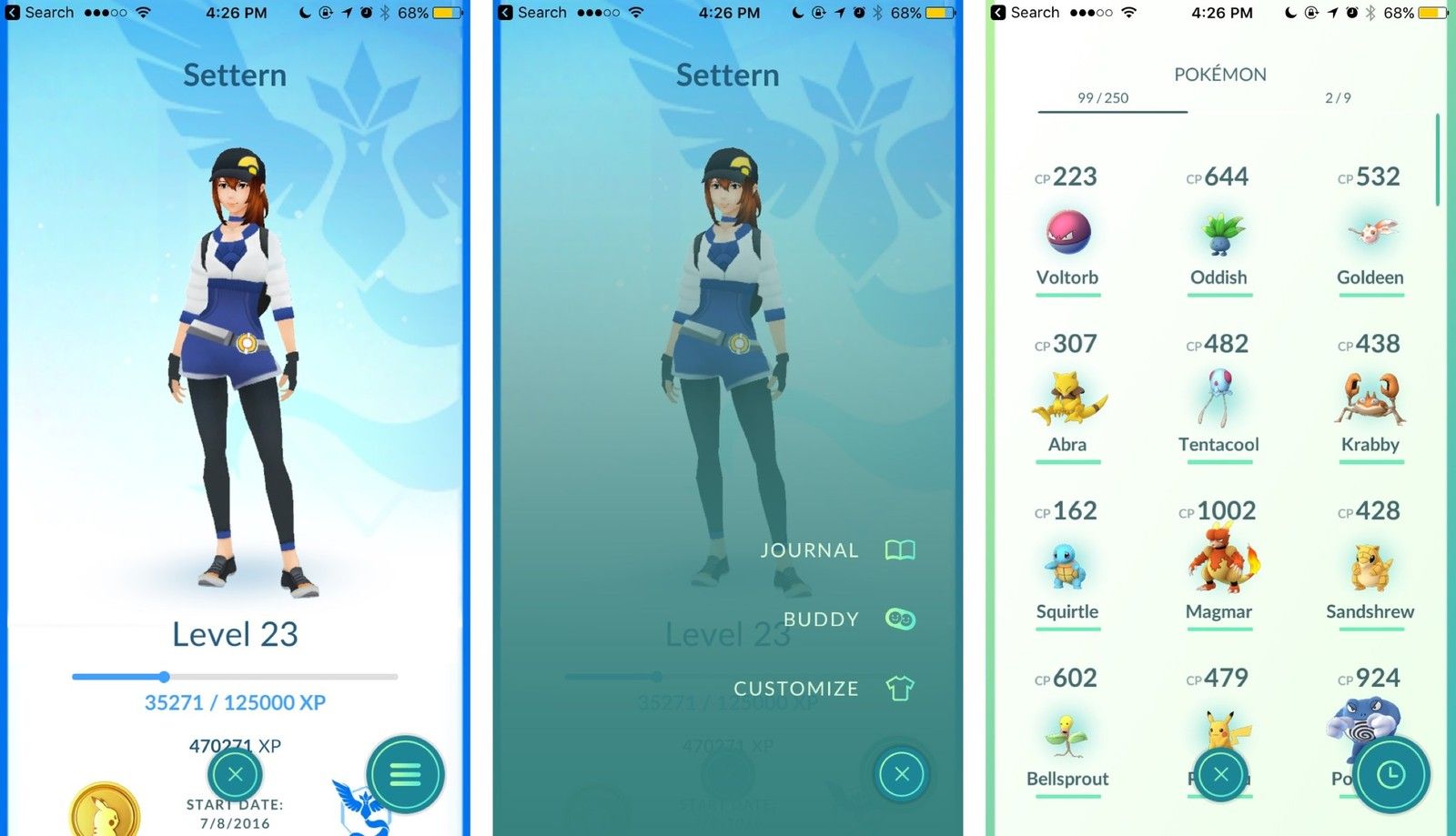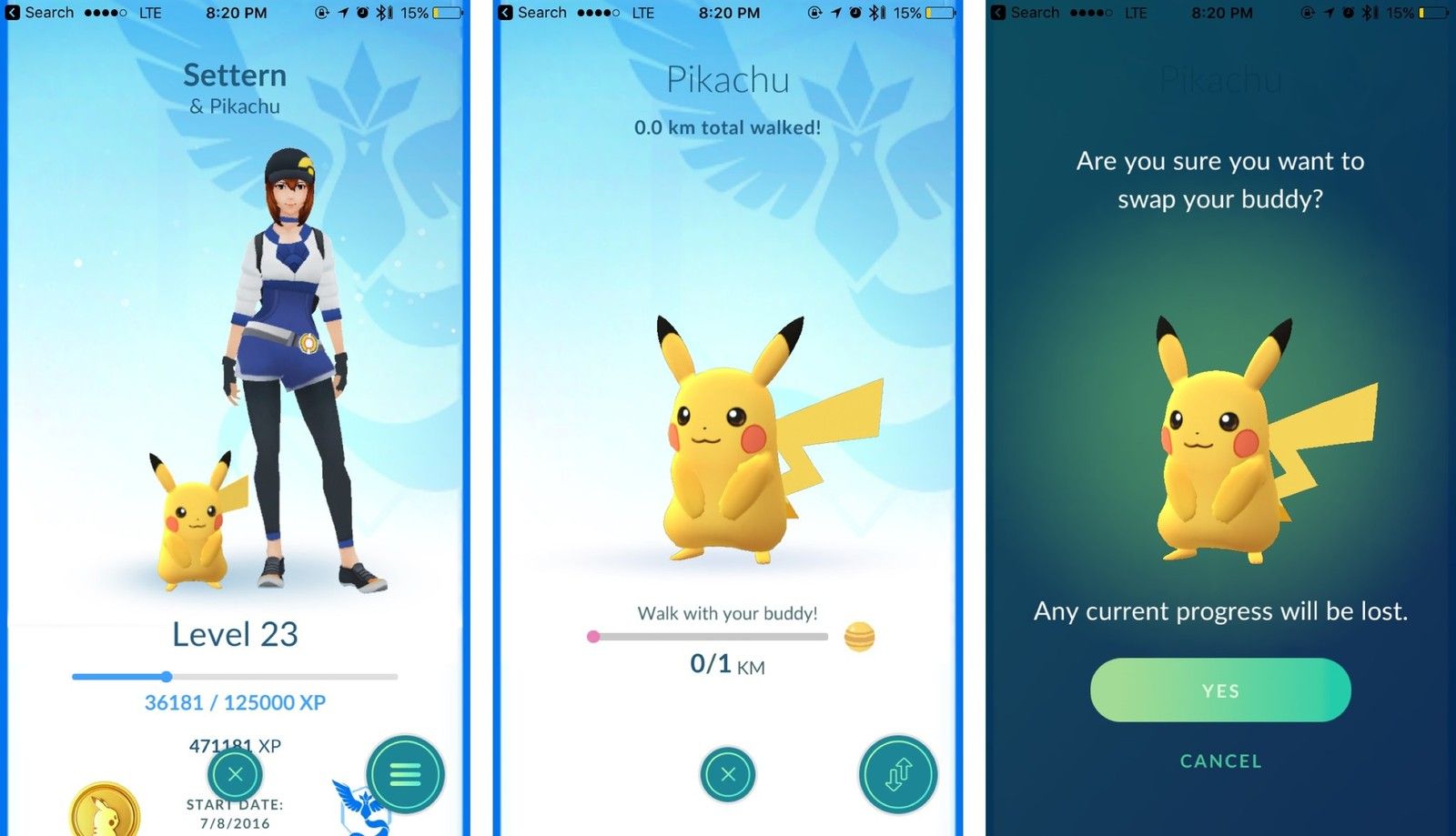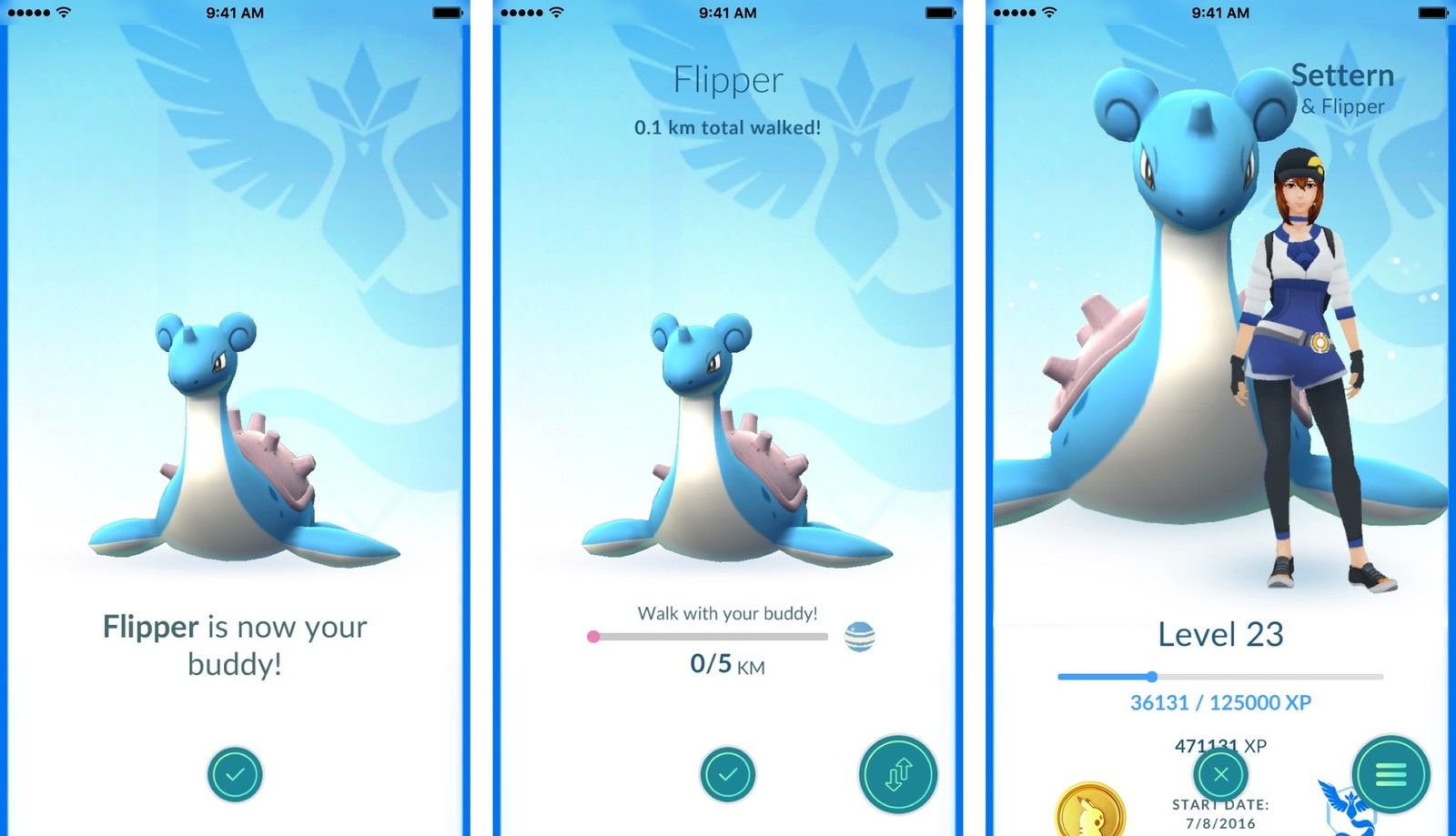 Ваш выбранный покемон теперь ваш приятель! Хотя они не будут ходить рядом с вами на карте, они будут иметь крошечный аватар справа от вашего портрета, и вы можете в любой момент нажать на экран тренера, чтобы увидеть, как далеко вы прошли со своим покемоном.