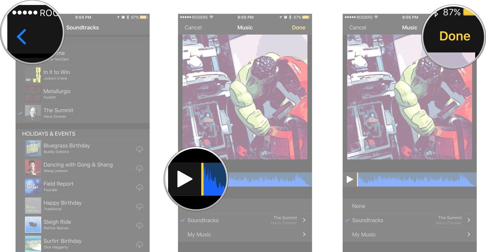 Если позже вы передумаете о саундтреке или музыке, добавленной в ваше видео, вы можете в любой момент переключиться — или переключиться между ними.