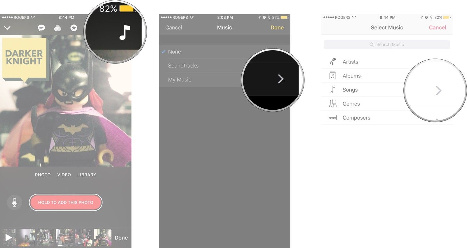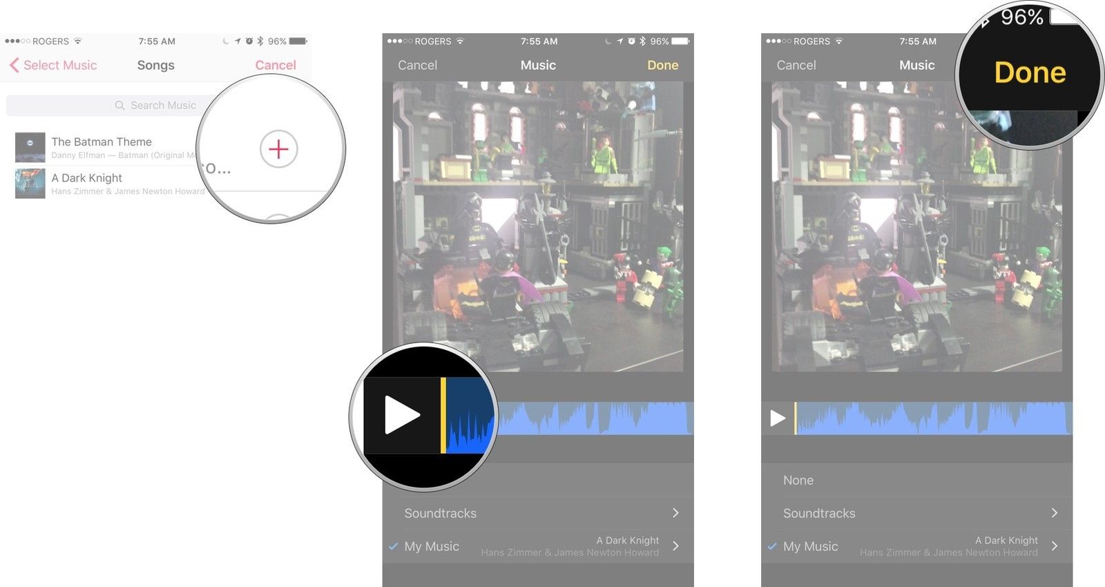 Apple очень легко добавила саундтрек к вашему видео. Это просто не совсем интуитивно понятно. Хитрость в том, что вы должны быть на главном экране и готовы добавить новый клип. Вы можете просто нажать на существующий клип, а затем попытаться добавить саундтрек.