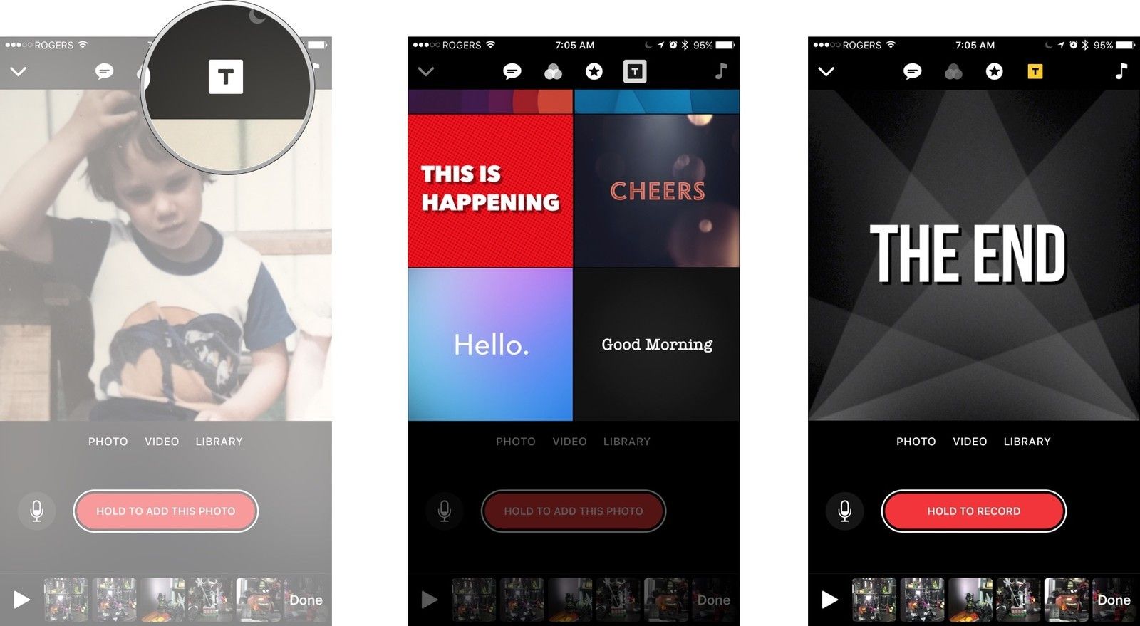 - Нажмите и удерживайте Держите, чтобы записать добавить титульную карточку в ваши клипы. (Чем дольше вы держите, тем дольше титульная карточка будет оставаться в вашем видео.)