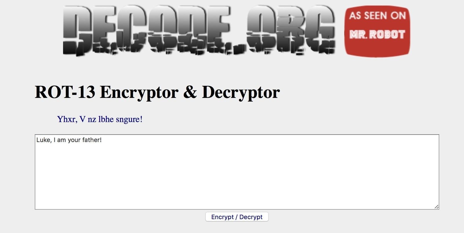ROT-13 — разновидность шифра замещения Цезаря, который берет существующий текст и перемещает каждую букву вперед («вращая») на 13 позиций в алфавите. Например, «Люк, я твой отец» станет «Yhxr, V nz lbhe sngure».