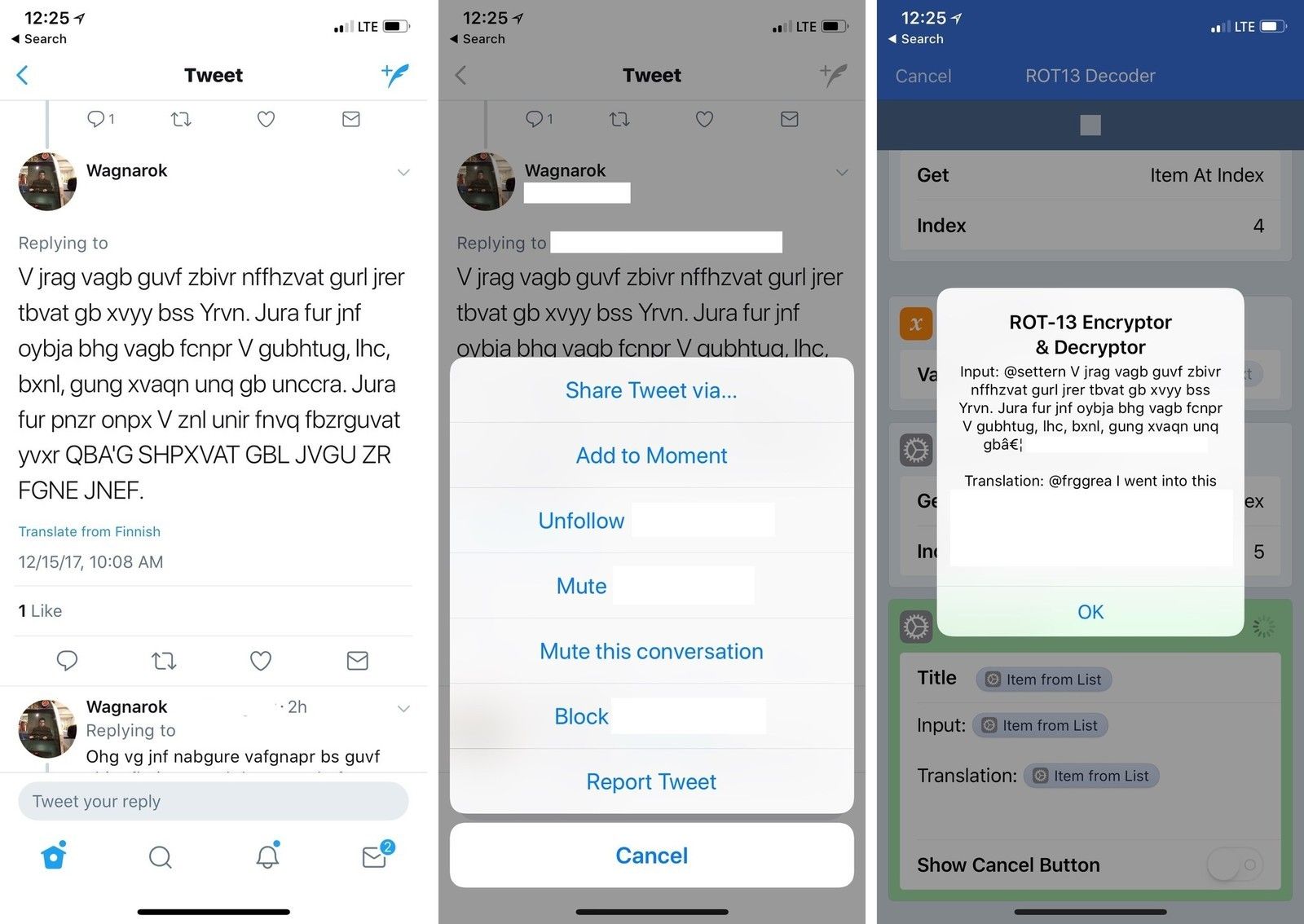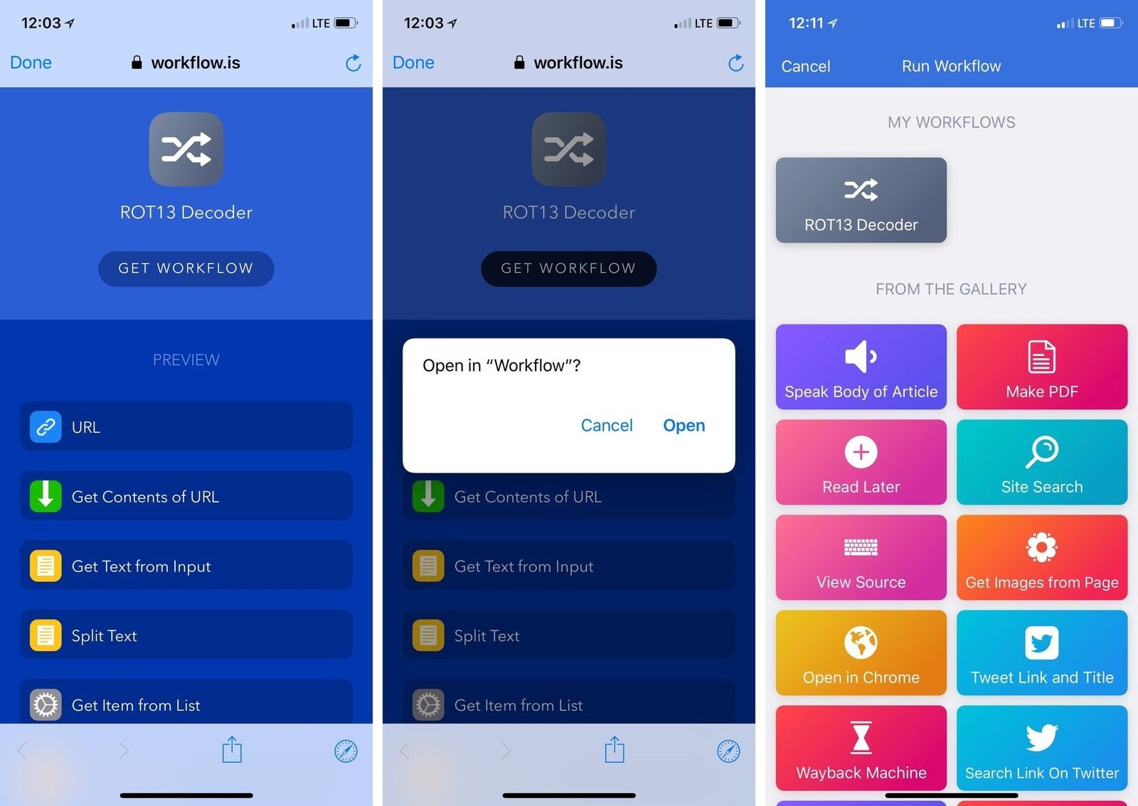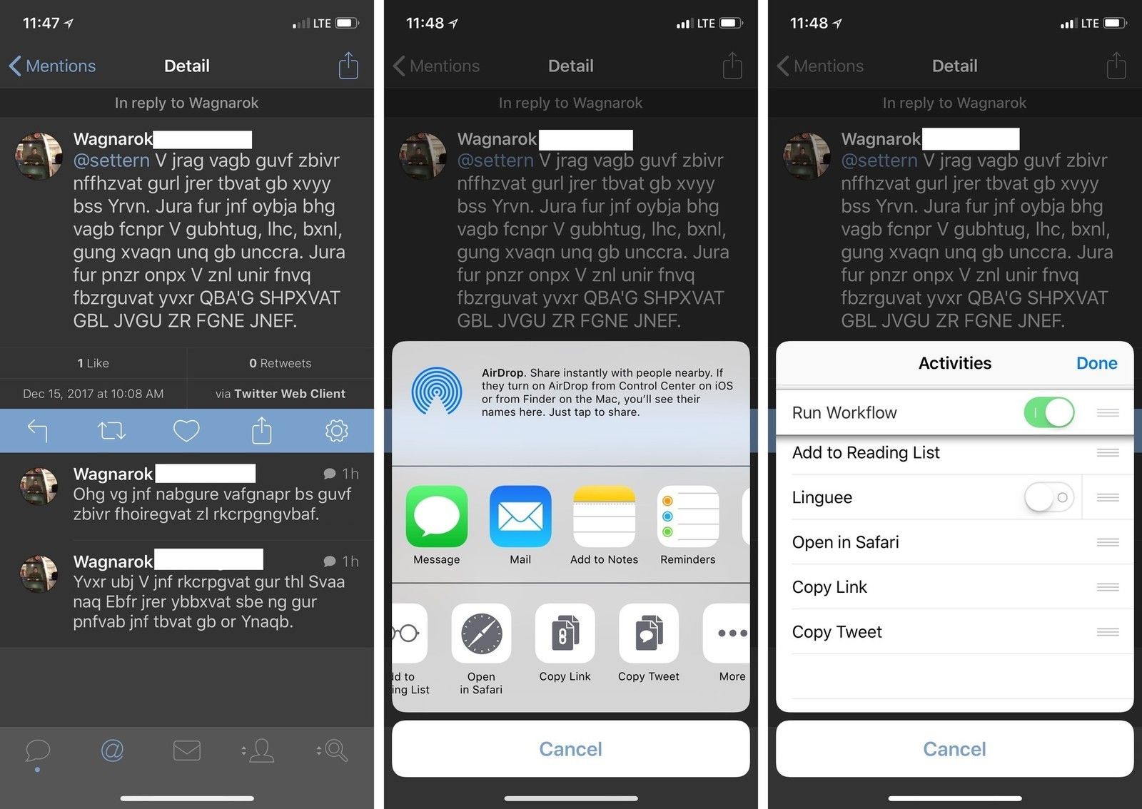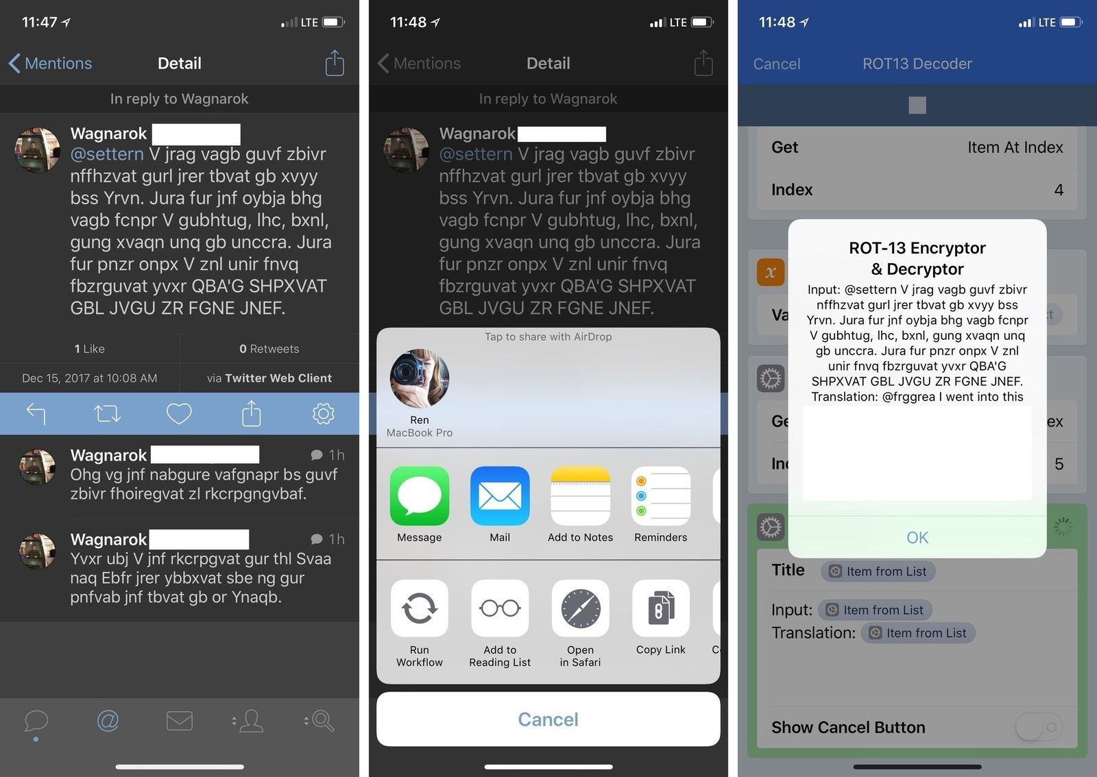 Несмотря на то, что вы можете добавить в закладки decode.org и переключаться между приложениями при декодировании ROT-13, более простым решением является использование рабочего процесса Apple.