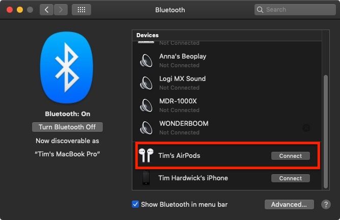 В идеале все, что вам нужно сделать, это положить «AirPods» в уши, щелкнуть значок Bluetooth в строке меню вашего Mac, выбрать «AirPods» в раскрывающемся списке и нажать соединять.
