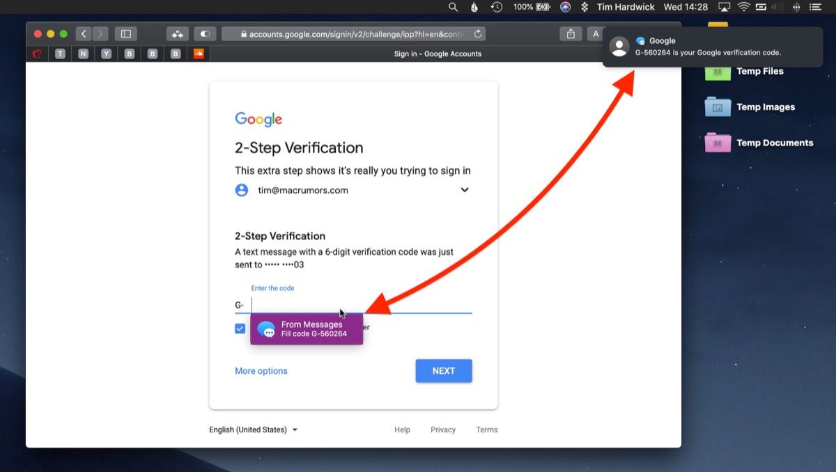 Если вы включили пересылку текстовых сообщений на своем iPhone, вы также можете использовать функцию автозаполнения безопасного кода в MacOS Mojave. Код должен появиться в Safari как опция автозаполнения в соответствующем поле, как только SMS будет доставлено в Сообщения на вашем Mac.