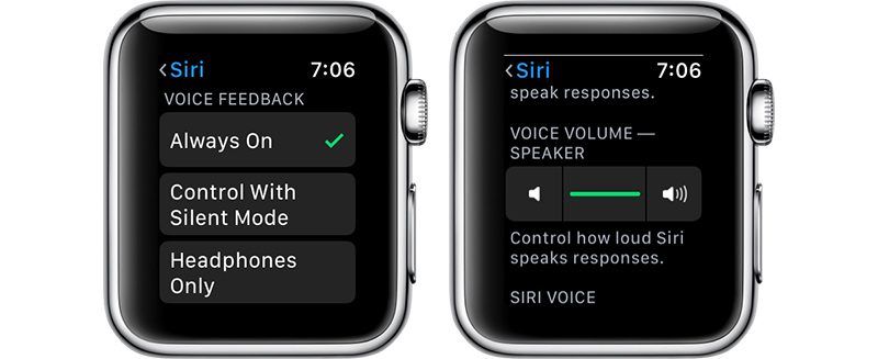 В разделе «Siri» приложения «Настройки», доступ к которому можно выполнить, выполнив описанные выше действия, вы также можете выбрать настройки голосовой обратной связи для каждого случая, когда «Siri» активирован, если у вас есть «Apple Watch» серии 3.