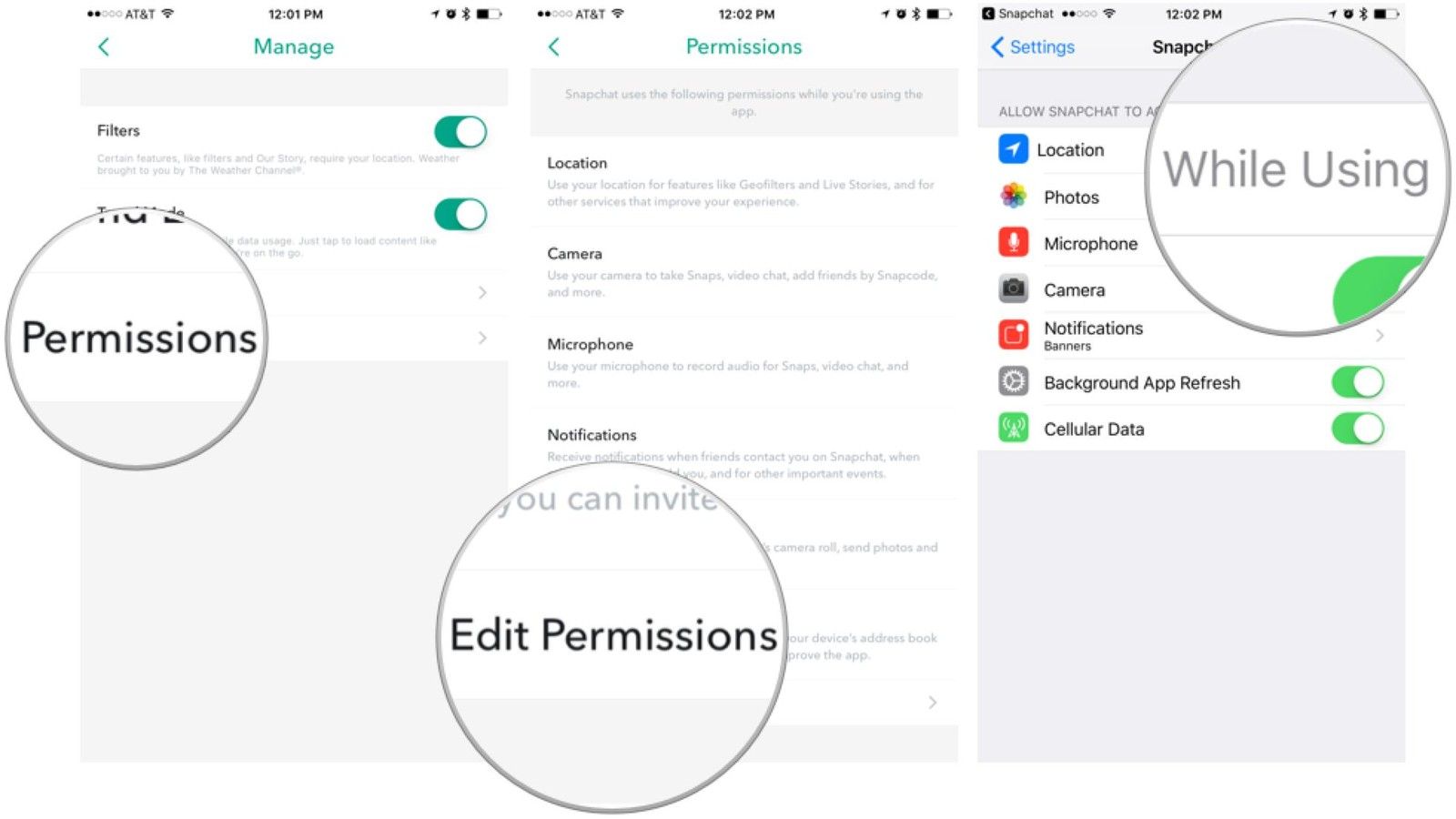 - Убедись Место нахождения установлен в При использовании Snapchat.