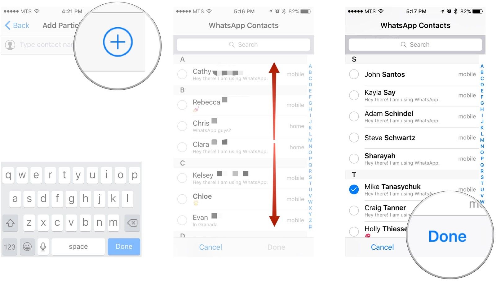 - Проведите по списку контактов и коснитесь контакт добавить их в группу.