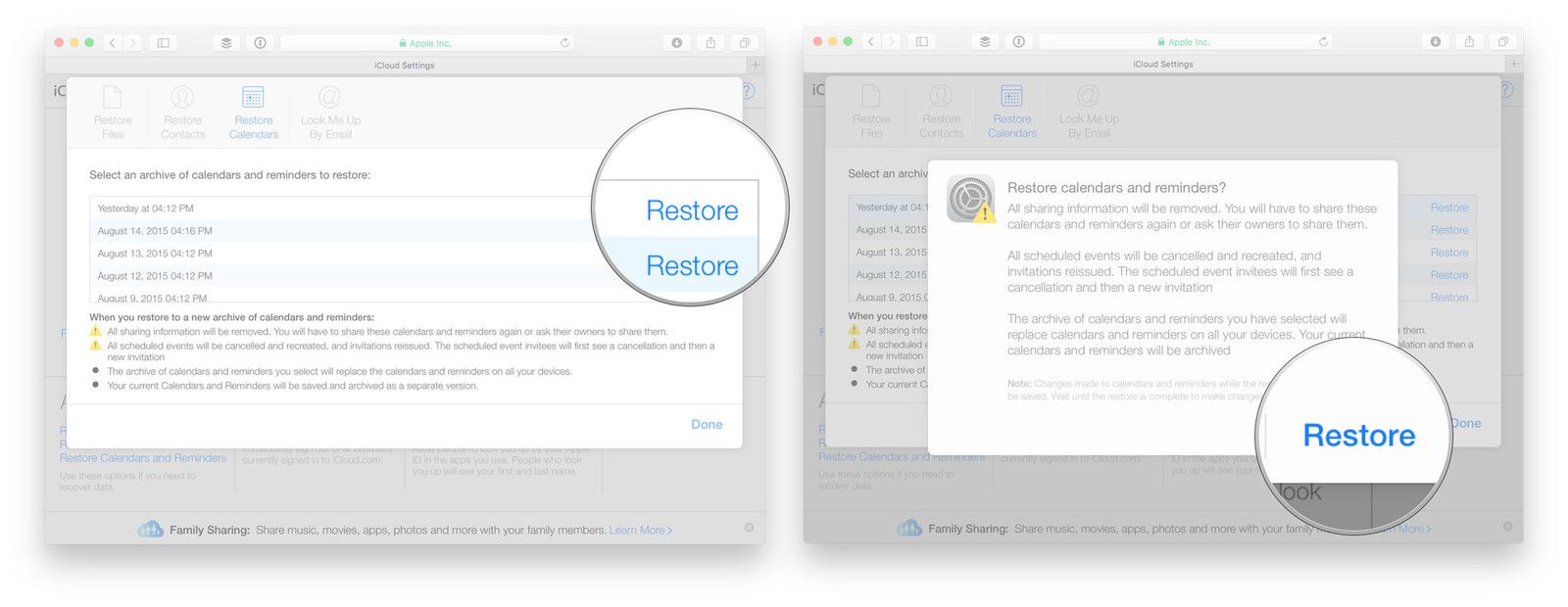Нажмите на Восстановить календари и напоминания под продвинутый полностью внизу слева.