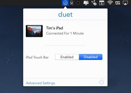После того, как все заработало, стоит проверить параметры отображения Duet: щелкните апплет Duet в строке меню вашего Mac и, если у вас подключен iPad, вы увидите кнопку для включения сенсорной панели MacBook Pro в стиле Touch Bar вдоль нижней части экрана вашего iPad.