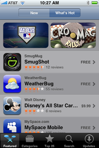 На странице, которая приветствует вас при входе в iPhone App Store, вы сможете просмотреть новые добавленные приложения и самые популярные и часто загружаемые приложения в разделе «Что нового». Приложения отображаются в списке с рейтингом до 5 звезд и ценой. Внизу вы найдете вкладки «Избранные», «Категории», «Топ 25», «Поиск» и «Обновления».
