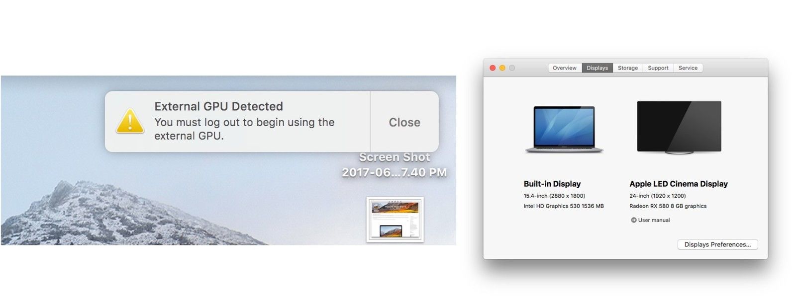 После подключения ваш eGPU будет обнаружен, а ваш внешний дисплей будет автоматически настроен!