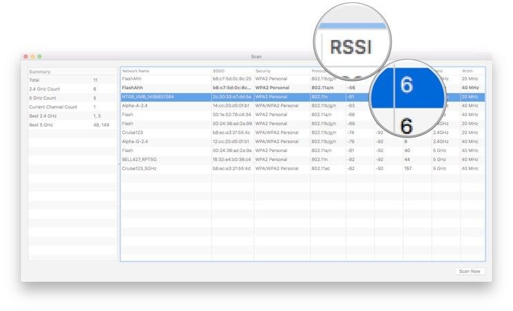- В вашей Диагностический инструмент для беспроводной диагностики, вы заметите заголовок RSSI. Для простоты RSSI — это уровень сигнала точки доступа. Чем ниже, тем лучше. Перейдите на вкладку RSSI, чтобы список RSSI был в порядке возрастания. Ваша личная точка доступа должна быть указана ближе к вершине, так как она ближе всего к вашему Mac. Если это не так, перезапустите сканер, физически сидящий рядом с точкой доступа.