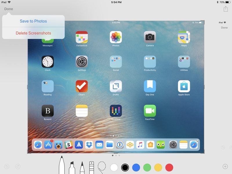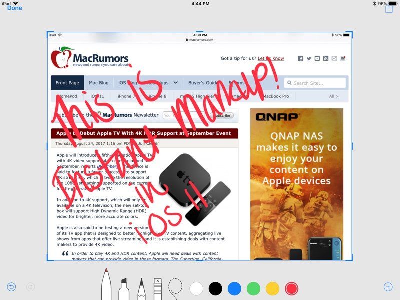 - Выберите ручку / маркер / карандаш и цвет, а затем нарисуйте пальцем или Apple Pencil (на iPad Pro), чтобы отредактировать снимок экрана.