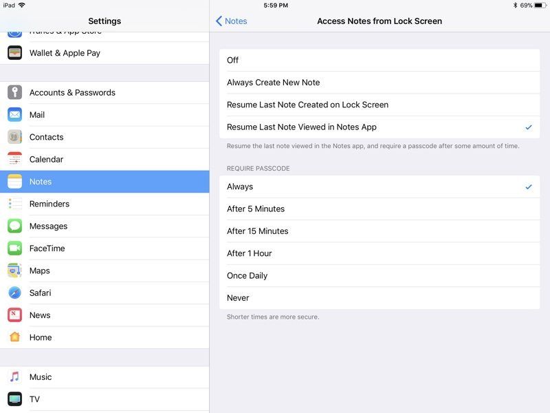Для параметра «Возобновить последнюю заметку, просмотренную в приложении заметок», вы можете установить ограничение по времени, после которого потребуется пароль для просмотра заметки. Это гарантирует, что кто-то, кто завладеет вашим iPad, не сможет получить доступ к конфиденциальным данным.