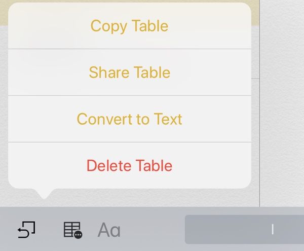 - Чтобы скопировать таблицу, поделиться таблицей, преобразовать таблицу в текст или удалить таблицу, удерживайте палец на значке таблицы в приложении Notes, чтобы открыть дополнительные параметры.