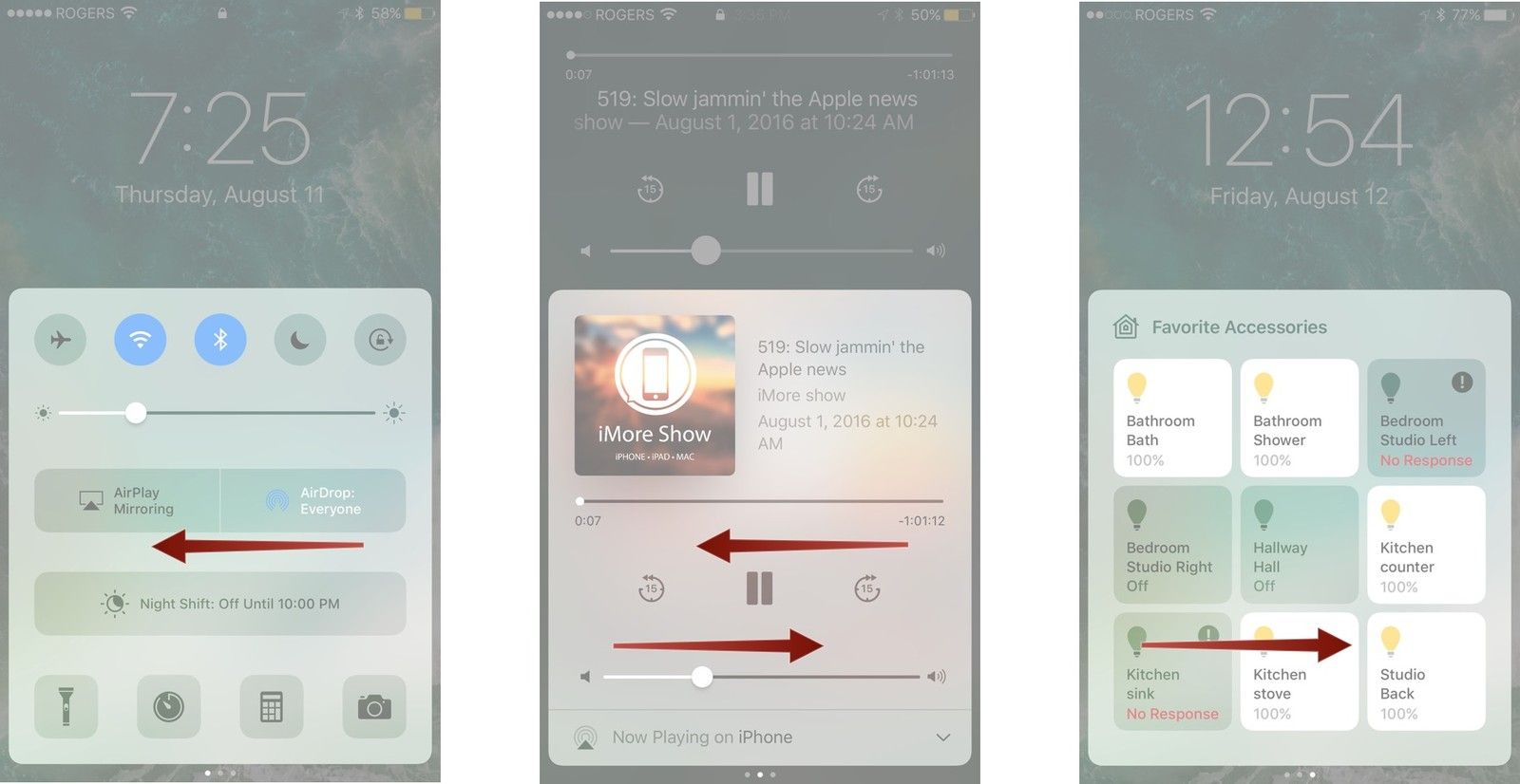 Центр управления в iOS 10 был разделен на три отдельные панели. Вы можете переключаться между ними одним движением. Сейчас играет средняя панель.