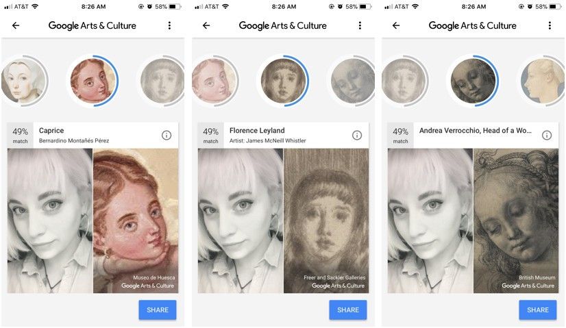 По сути, приложение использует технологию распознавания лиц для сканирования вашего лица, определяя уникальные для вас характеристики (например, размер ваших глаз или расстояние между носом и ртом). Затем он пытается сопоставить эти особенности с коллекцией из более чем 70 000 картин и других произведений искусства в своей базе данных.