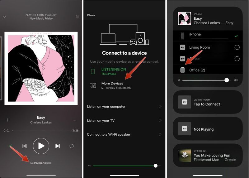 В большинстве музыкальных приложений вы можете запустить песню, а затем выбрать устройство для воспроизведения прямо из приложения. Эти инструкции будут относиться к Spotify.