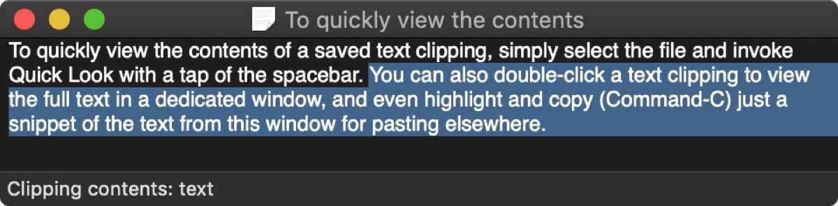 Вы также можете дважды щелкнуть «Обрезка текста», чтобы просмотреть текст в специальном окне, и даже выделить и скопировать (Command-C) просто фрагмент текста из этого окна для вставки в другом месте.
