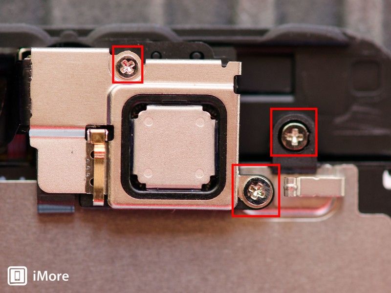 - Удалить два винта держа динамик динамика и кронштейн на месте сверху сборки. Вы также можете удалить один винт, который находится справа, и немного ниже этого. Это удерживает тепловой экран на задней части экрана. Для этого используйте свой # 000 отвертка.
