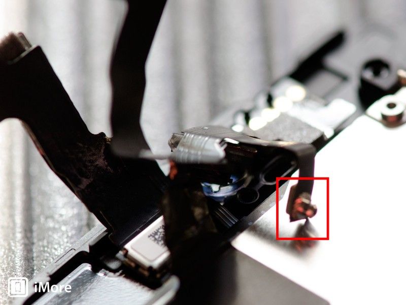 - Удалить верхний правый винт держа Сенсорный идентификационный кабель на месте, используя ваш # 000 отвертка. Под ним есть крошечный металлический кожух, убедитесь, что вы держите его на месте, чтобы кабель не вращался и не разрывался под ним. Также обратите внимание на ориентацию этого кожуха, так как вам нужно будет заменить его снова во время повторной сборки.