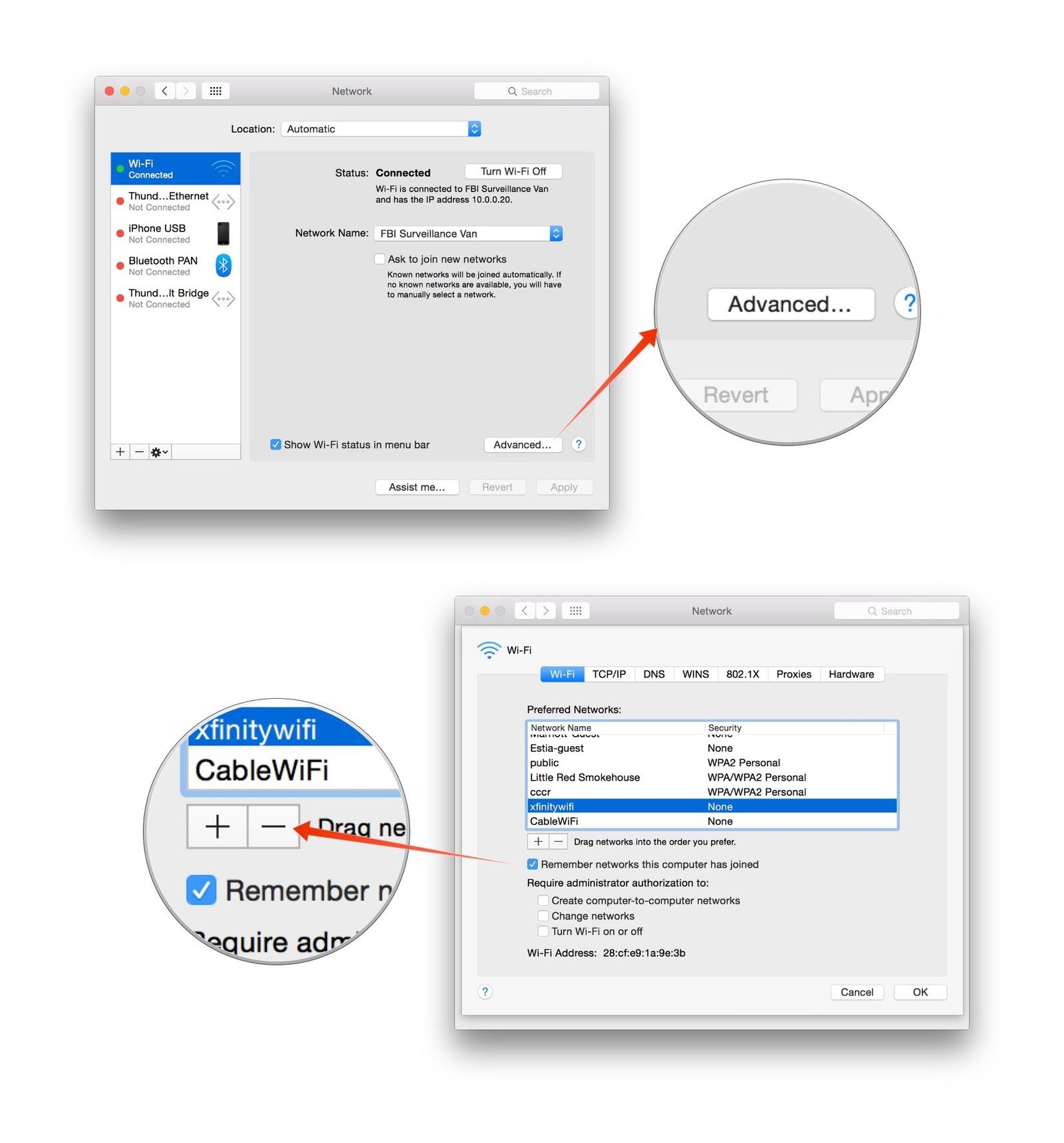 - Убедитесь, что выбранная вами сеть перетаскивается в верхнюю часть этого экрана. Если вы хотите полностью забыть о xfinitywifi, щелкните по его имени в списке и затем нажмите кнопку «-».