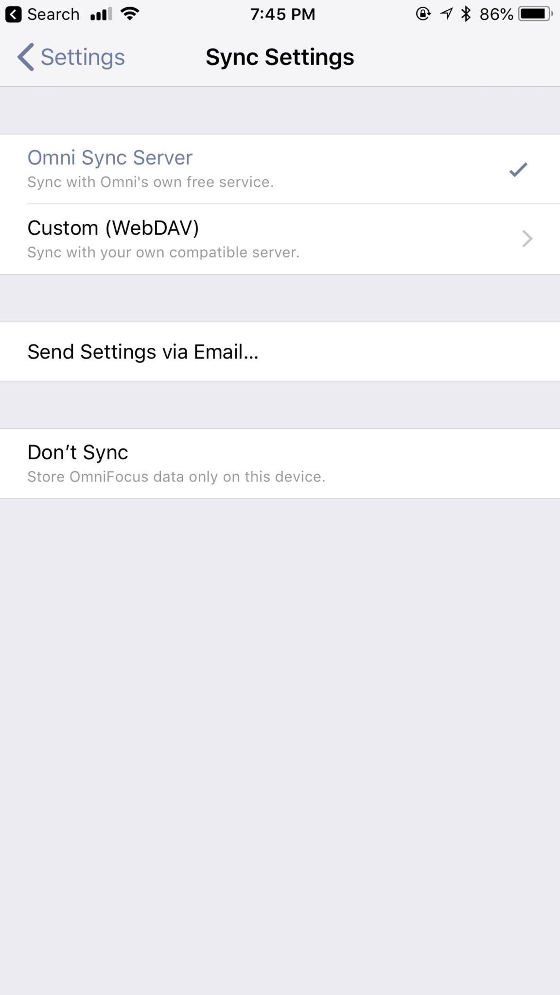 Если вы планируете использовать несколько устройств с OmniFocus, самое простое решение — Omni Sync Server. Это бесплатный сервис OmniGroup, и вы регистрируетесь на его сайте. Если вы не хотите регистрировать учетную запись, единственным другим вариантом синхронизации является Custom WebDAV с вашим собственным совместимым сервером. Или вы можете вообще не синхронизировать свои локальные задачи и проекты на одном устройстве.