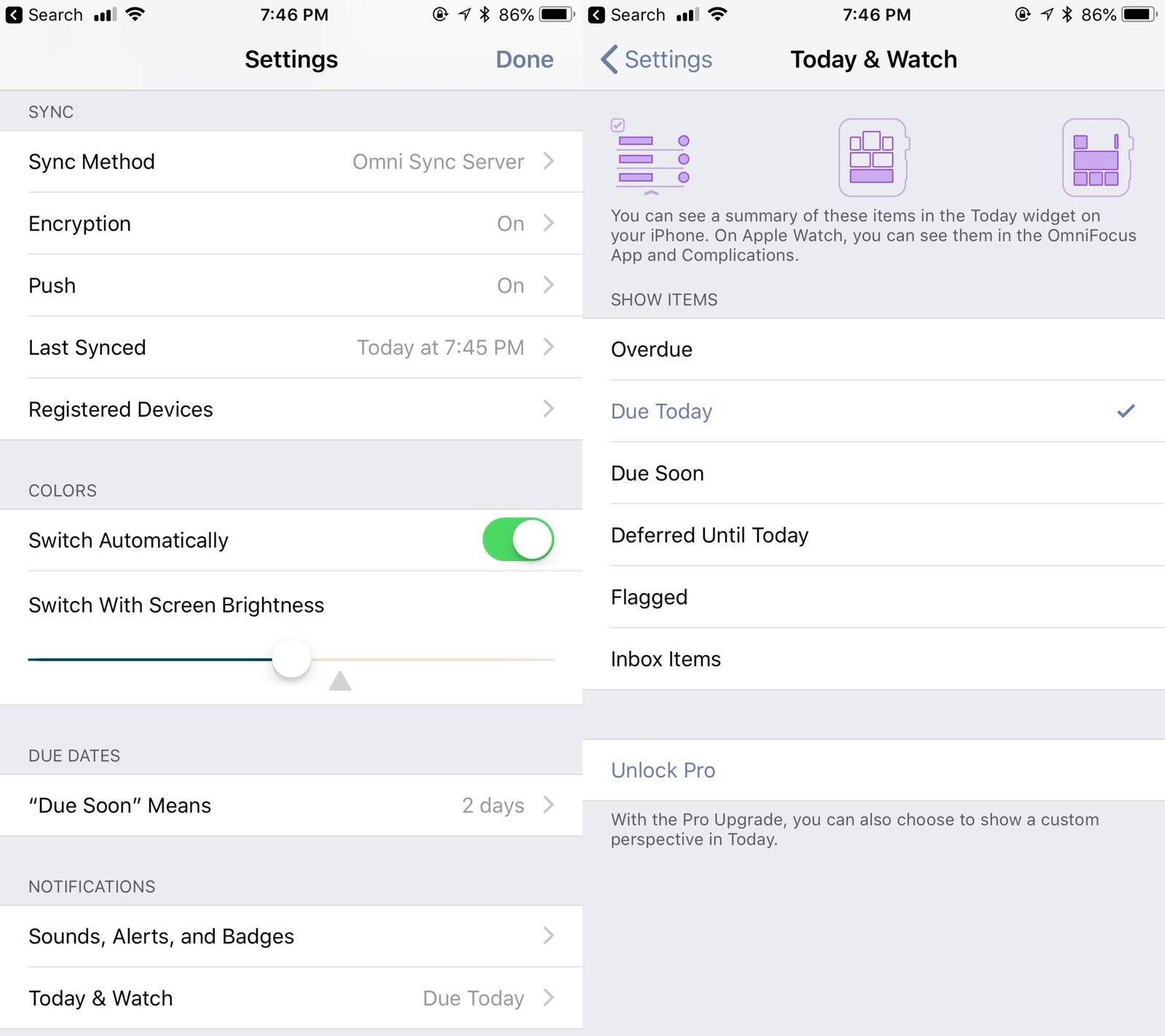 OmniFocus включает в себя полезный виджет «Сегодня» и сопутствующее приложение Apple Watch. С помощью этих инструментов вы можете отображать определенные элементы, такие как «С сегодняшним днем», или вы можете выбрать «Просроченные», «Должные в ближайшее время», «Отмеченные» элементы и многое другое. Это полезно, чтобы получить представление о том, что вам нужно выполнить, не запуская приложение.