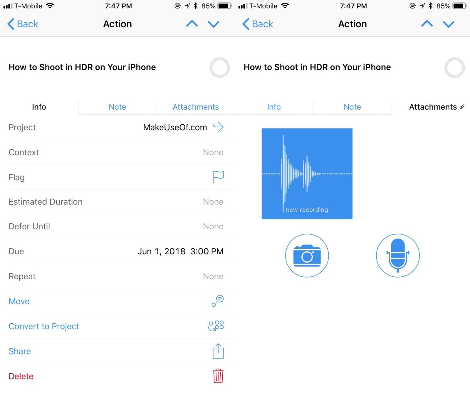 Первый шаг — присвоить вашему товару заголовок, который описывает задачу. Затем вы можете назначить его проектам, контекстам (проще говоря, они являются тегами), пометить его как важный, отложить его, дату и время, и сделать это повторяющейся задачей. Запись раздел позволяет добавлять текстовые заметки, которые могут вам понадобиться при работе над задачей, и Вложения включать изображения и аудиозаписи.