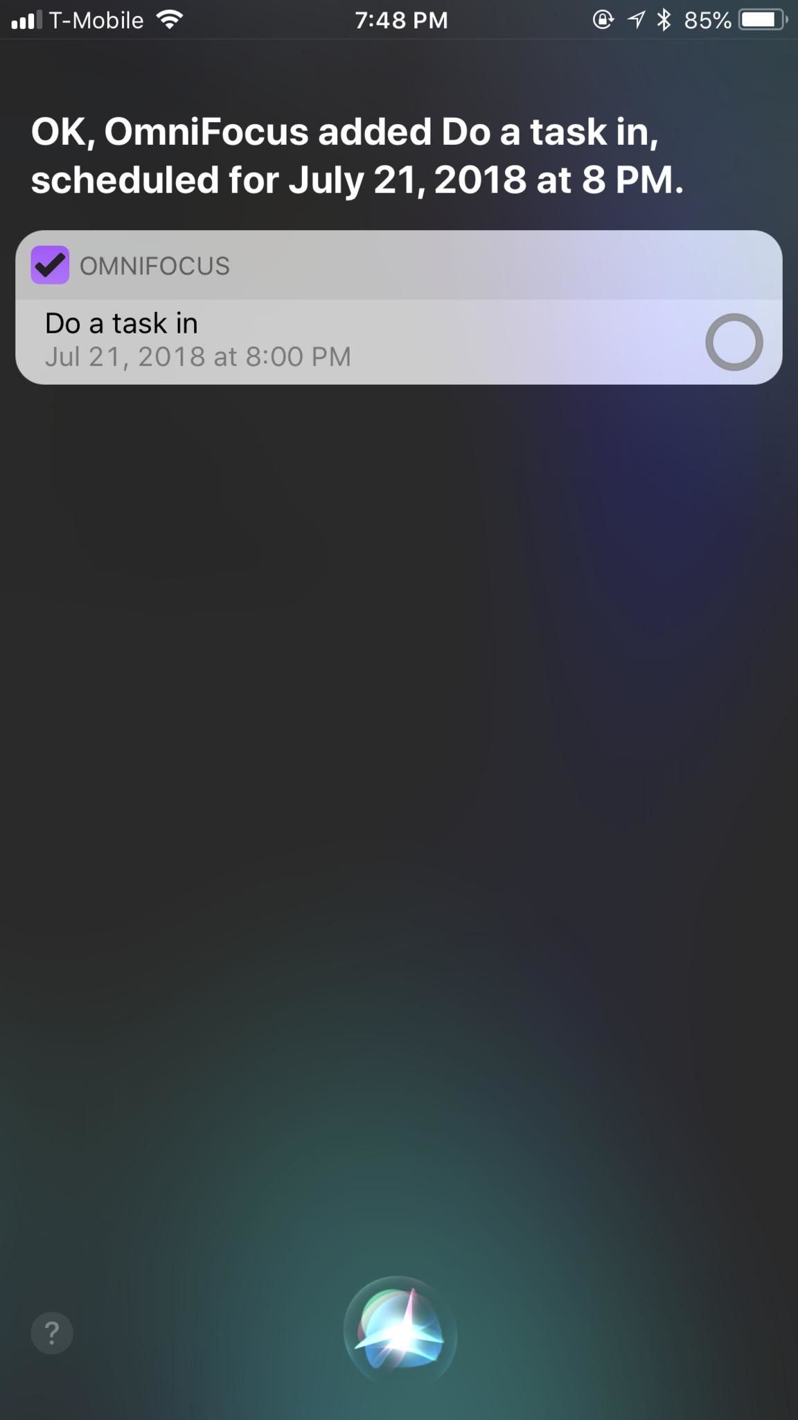 Есть также захват Siri, хотя для этого нужно, чтобы напоминания были интегрированы в OmnIFocus, как мы обсуждали ранее. Затем, когда вы выполняете обычную игру «Привет, Сири», произнесите что-нибудь с помощью шаблона: «Напомните мне выполнить вашу задачу в срок». Если он настроен правильно, Siri должен захватить его без проблем, и он будет отображаться в OmniFocus правильно.