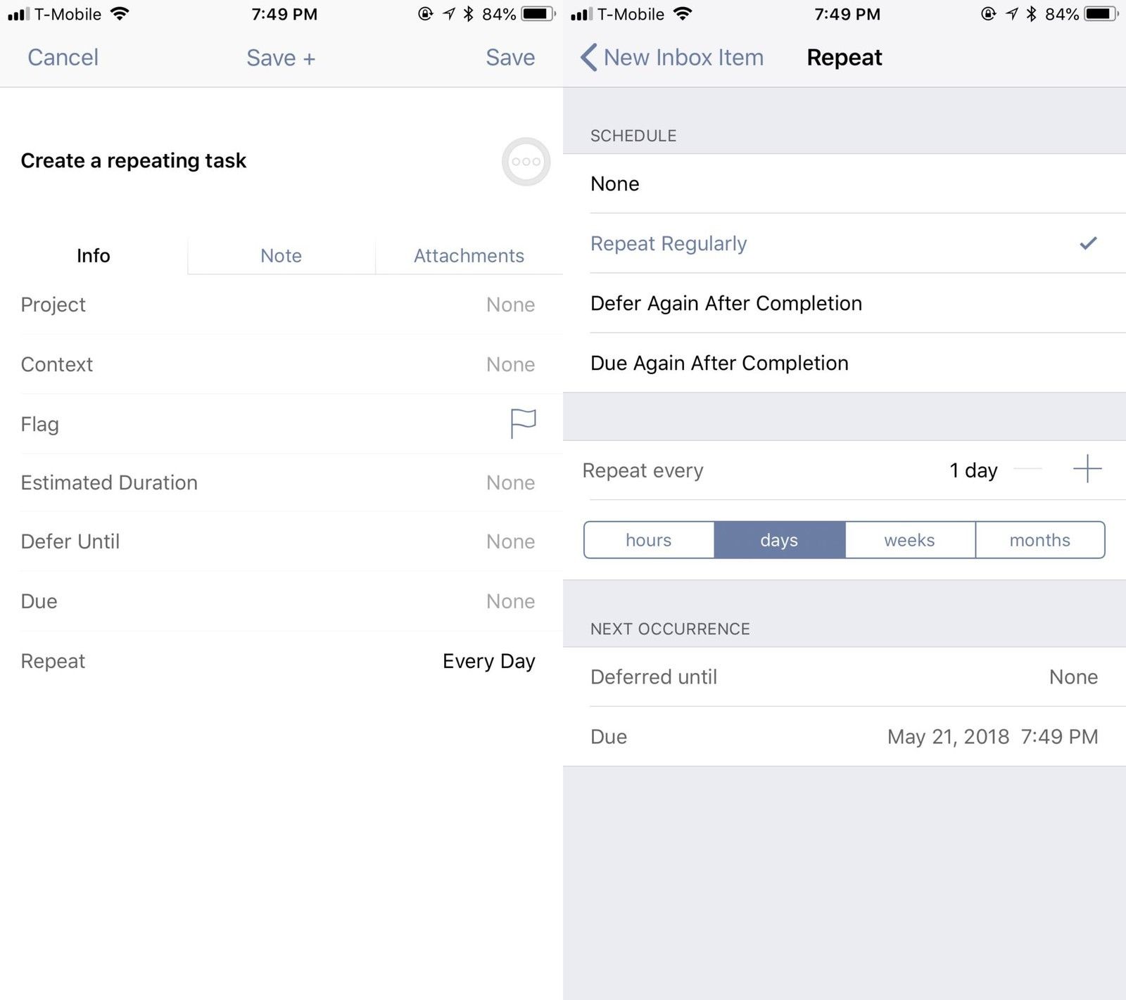 Чтобы повторять задачу, просто выберите вариант повтора при добавлении элемента. Вы можете регулярно повторять его через определенные промежутки времени или сделать отложить снова или же снова из-за после завершения. OmniFocus достаточно гибок, поэтому вы всегда можете изменить настройки повторения позже, если это будет необходимо.