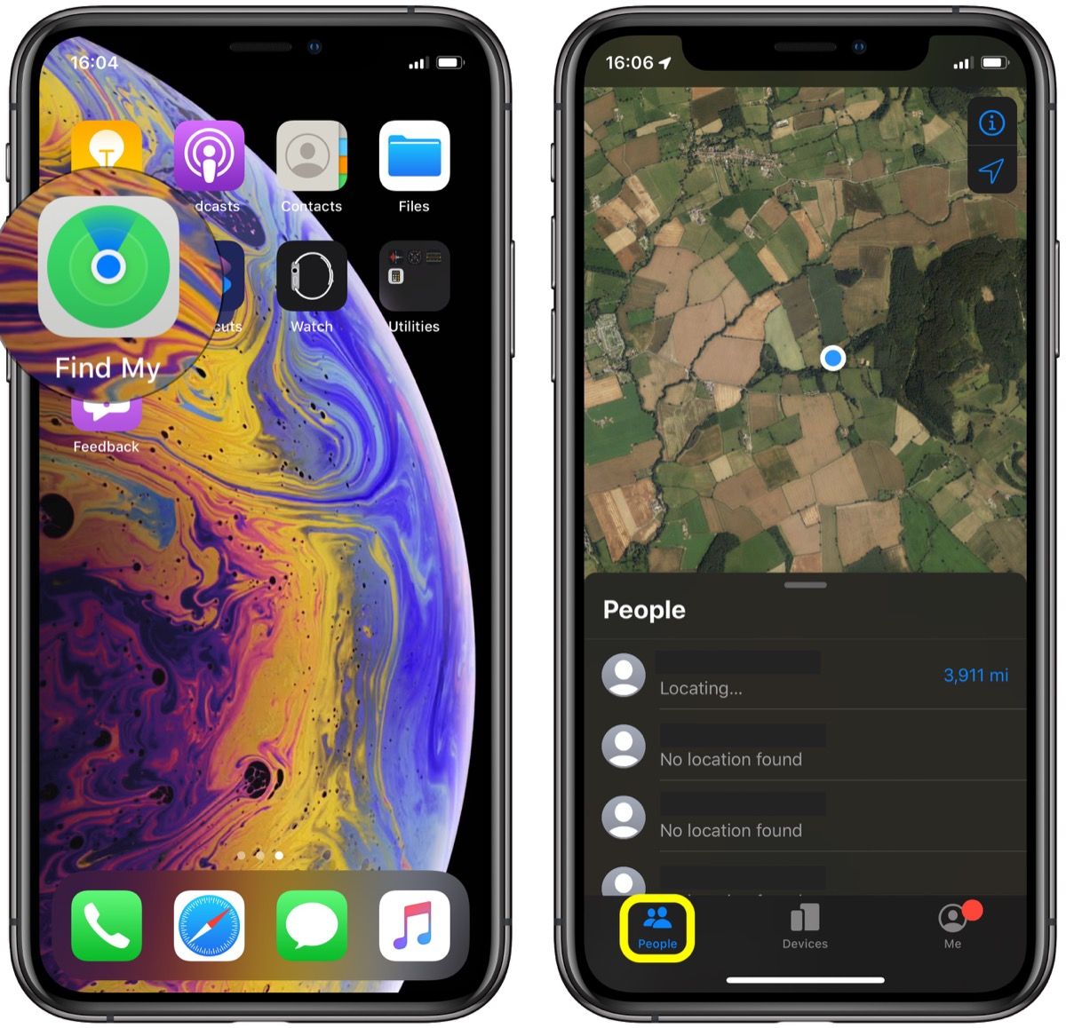 «Find My» работает так же, как и приложения, которые он заменяет. Например, новое приложение имеет раздел, который позволяет вам находить друзей и членов семьи, которые поделились с вами своим местоположением, и позволяет вам делиться своим местоположением в натуральной форме.