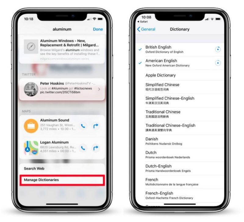 В следующий раз, когда вы найдете слово, вы получите индивидуальные определения из каждого установленного словаря. Обратите внимание, что вы можете добавлять и удалять словари в любое время, отметив их галочкой Настройки -> Общие -> Словарь.