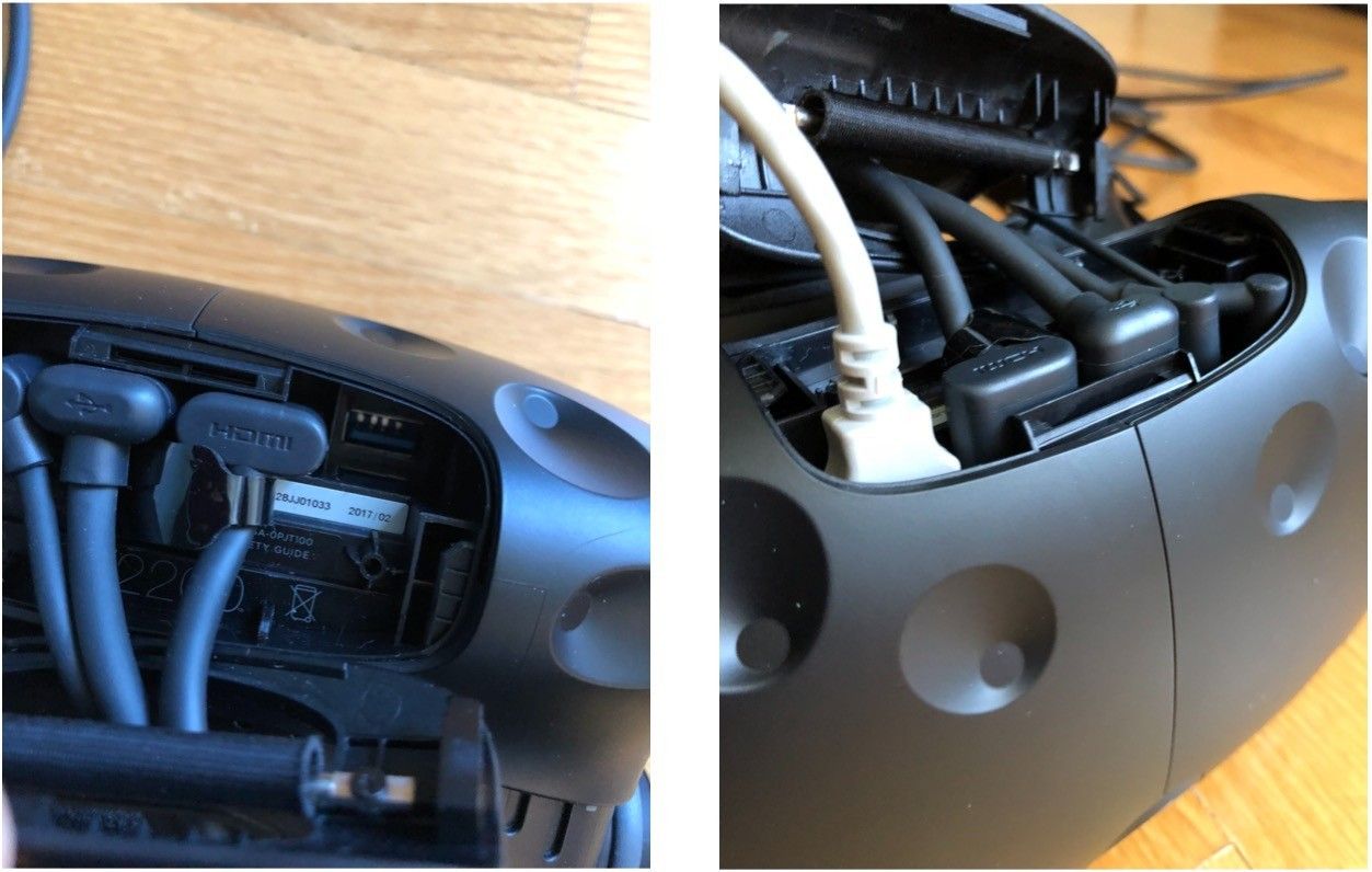 Снимите верхнюю скользящую крышку на HTC Vive, чтобы получить доступ к запасному порту USB.