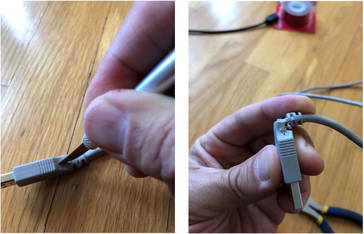 Если у вас есть стандартный запасной USB-кабель, вы заметите, что разъем будет слишком большим, чтобы укрыться под сдвижной крышкой. Это должно быть изменено. Это можно сделать, осторожно используя бритву или острый нож точным ножом части разъема USB, чтобы он мог свободно изгибаться в стороны под крышкой кабеля.