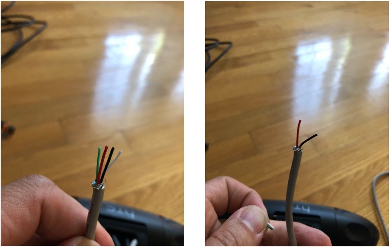 Отрежь зеленый и белый провода оставляя только черные и красные провода в длину.