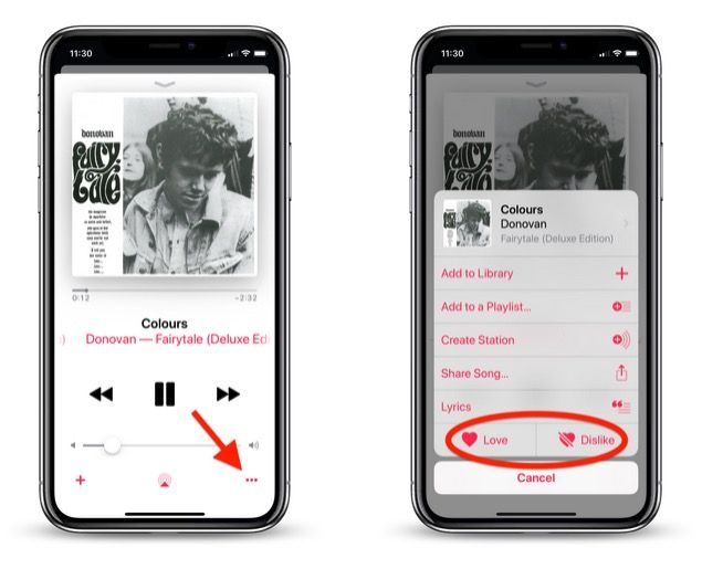 Это открывает дополнительную панель параметров, внизу которой вы увидите кнопки «Любить» и «Не нравиться». Вы можете нажать любой из них, и «Apple Music» будет использовать ваши предпочтения, чтобы направлять свои алгоритмы рекомендации в дальнейшем.