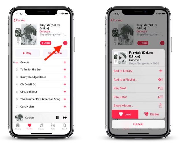 Вы также можете получить доступ к этим кнопкам, чтобы указать, нравится ли вам альбом или нет. На любом экране альбома нажмите красную кнопку с многоточием в правой верхней части экрана.