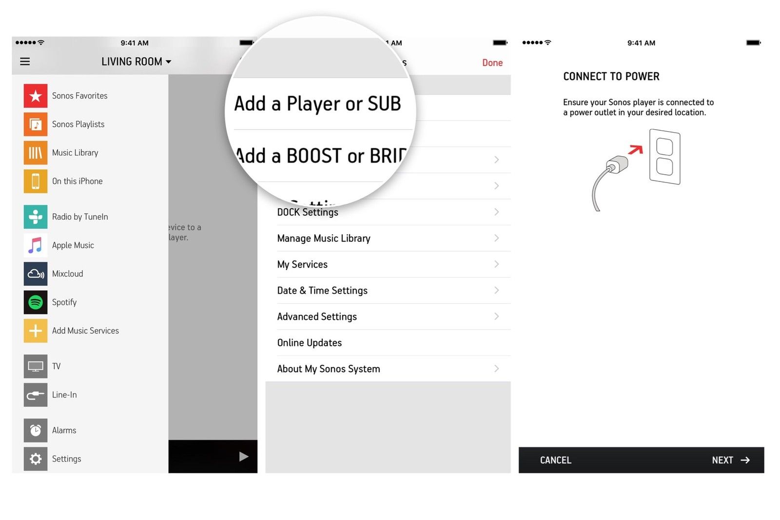 - Нажмите Добавить игрока или SUB и следуйте инструкциям, чтобы настроить плеер Sonos. Вы также выберете комнату, в которой живет ваш игрок.