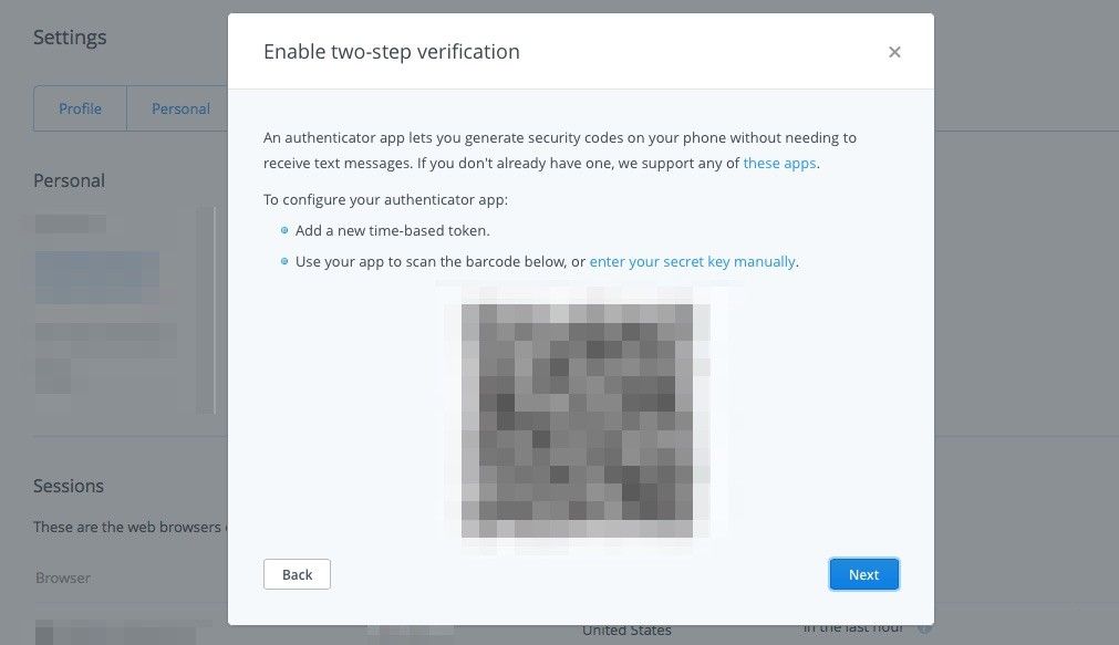 - Если вы выбираете Используйте текстовые сообщения, вам нужно будет ввести свой номер телефона, а затем ввести код, отправленный на ваш телефон. Если вы выбираете Используйте мобильное приложение, Dropbox представляет QR-код для сканирования с помощью приложения Google Authenticator или Authy. Отсюда вам придется добавить резервный номер мобильного телефона, на всякий случай.