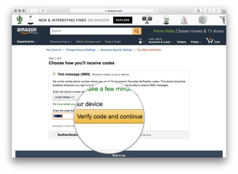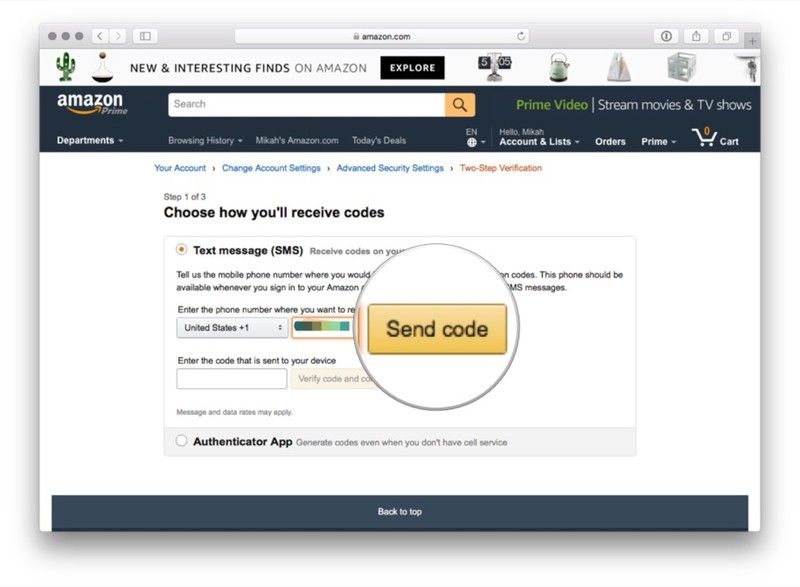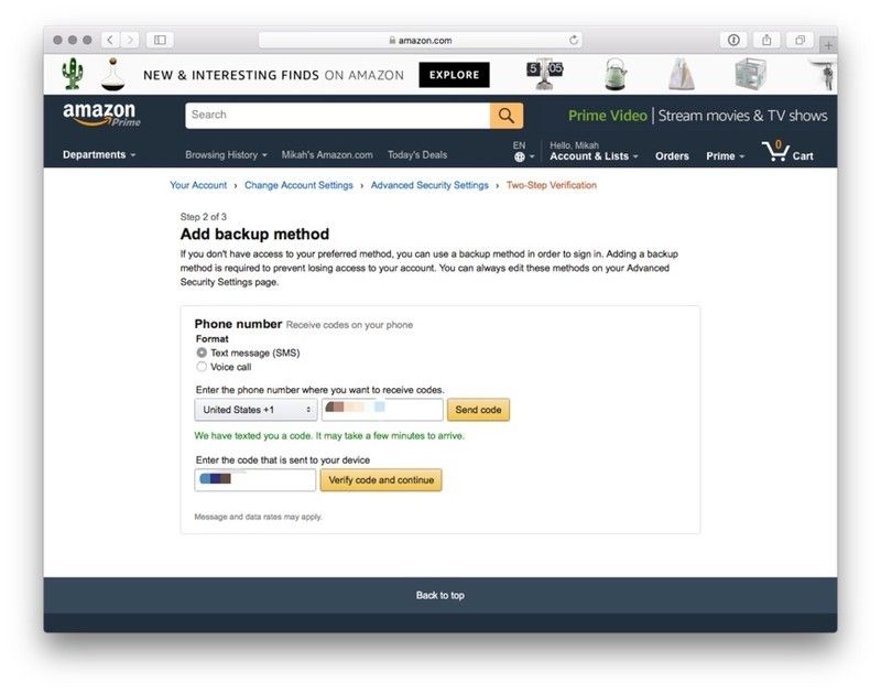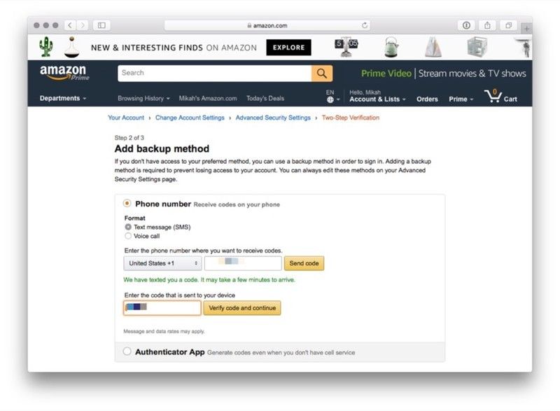 Если вы предпочитаете получать коды двухфакторной аутентификации в виде текстового сообщения, вы можете использовать этот метод. Имейте в виду, что вам понадобится второй номер телефона или приложение для аутентификации, если вы используете этот метод — Amazon требует резервного метода аутентификации на тот случай, если ваш основной метод недоступен.